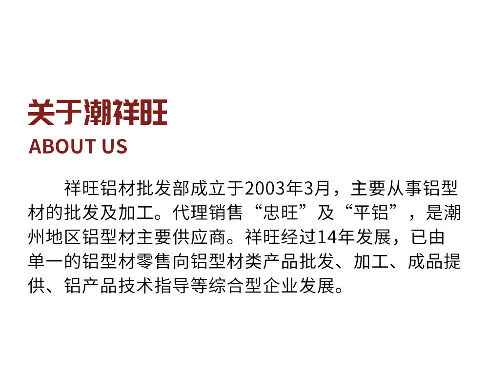 祥旺鋁材批發(fā)部成立于2003年3月,主要從事鋁型材的批發(fā)及加工。